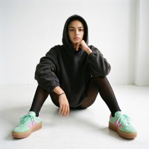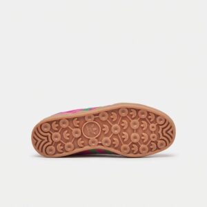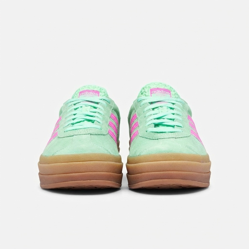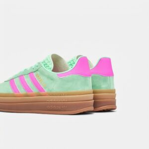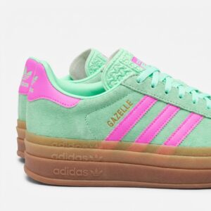 Gazelle Bold to nowoczesna interpretacja kultowego modelu Adidas z charakterystycznie pogrubioną podeszwą. Cholewka z miękkiej skóry zamszowej w kolorze Clear Mint została uzupełniona kontrastowymi różowymi paskami Three Stripes oraz ozdobnymi elementami w tym samym odcieniu. Model łączy retro estetykę z współczesnymi proporcjami.