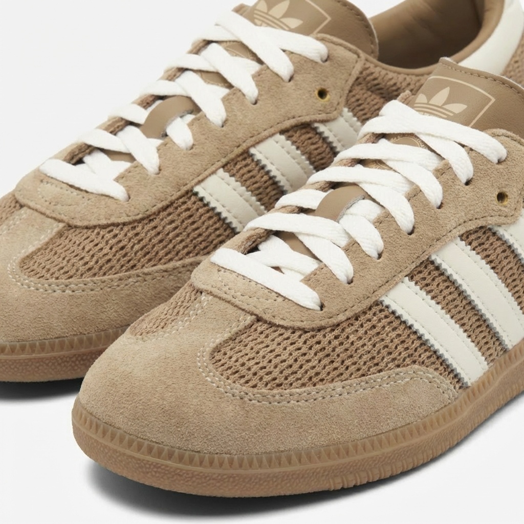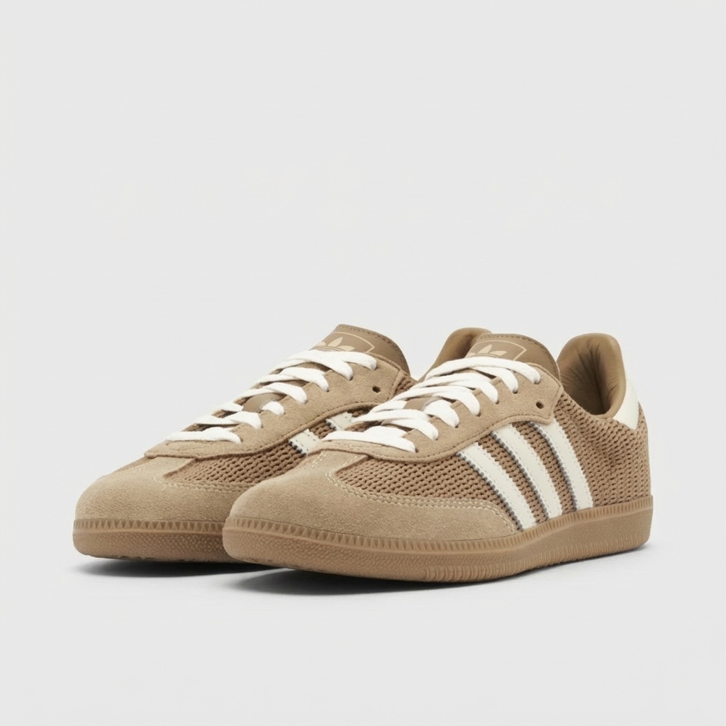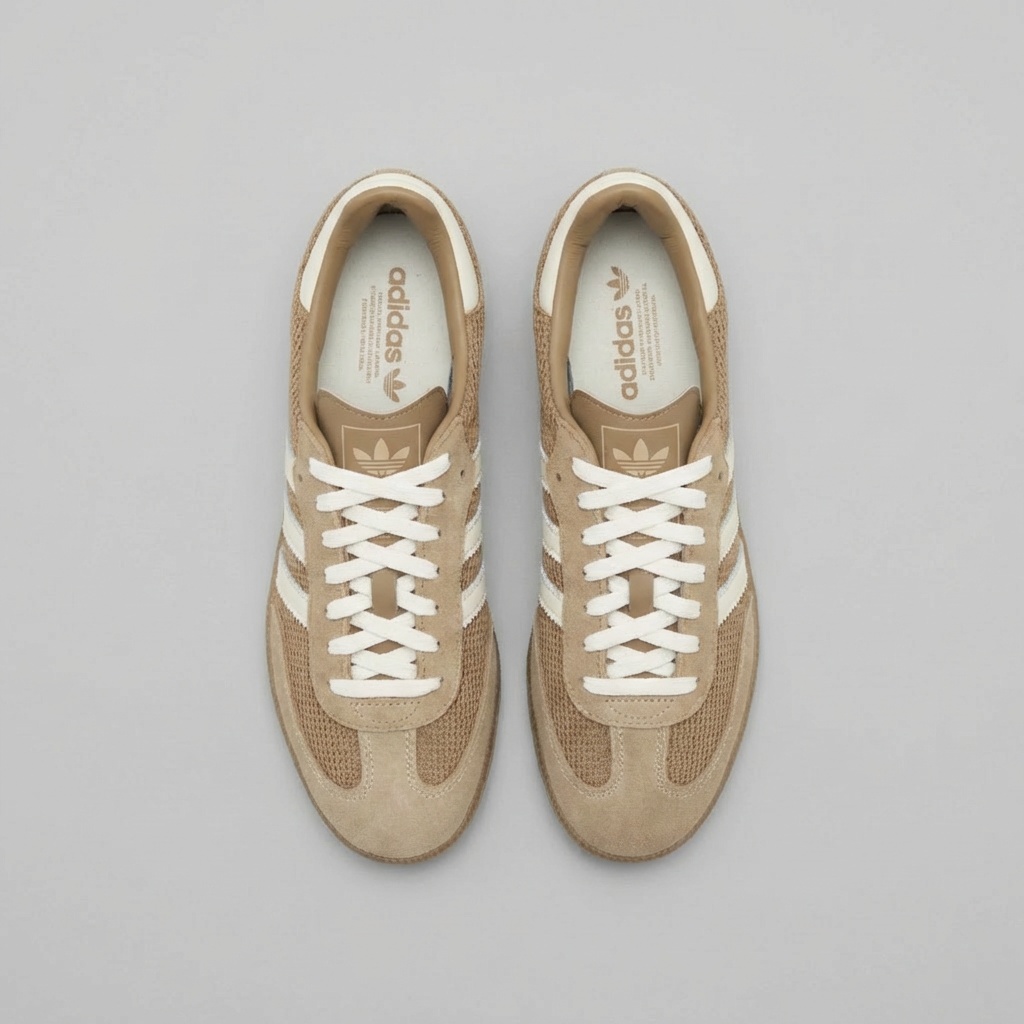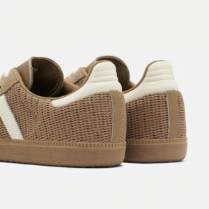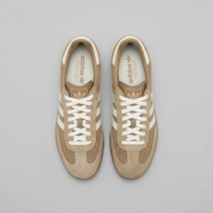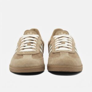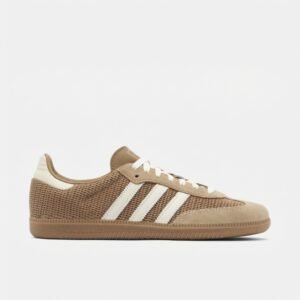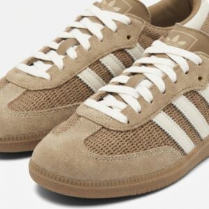 Buty Adidas Samba OG to klasyczne sneakersy w kolorze cardboard, które łączą tradycyjny design z funkcjonalnością. Model ten charakteryzuje się połączeniem miękkiej skóry zamszowej na cholewce z siateczką na przodzie buta, co zapewnia dobry przepływ powietrza. Charakterystyczne białe paski marki Adidas i ton w ton podeszwa dopełniają neutralnej kolorystyki.