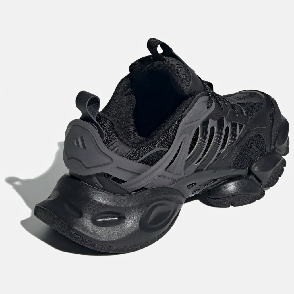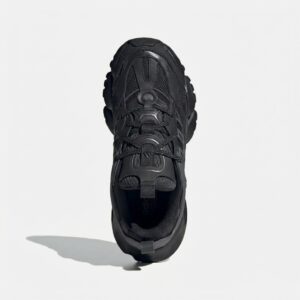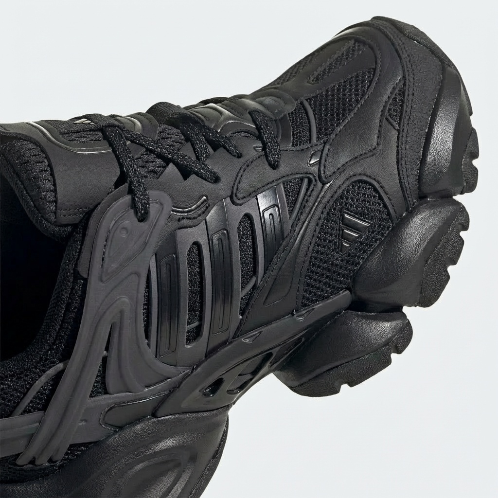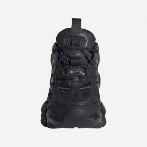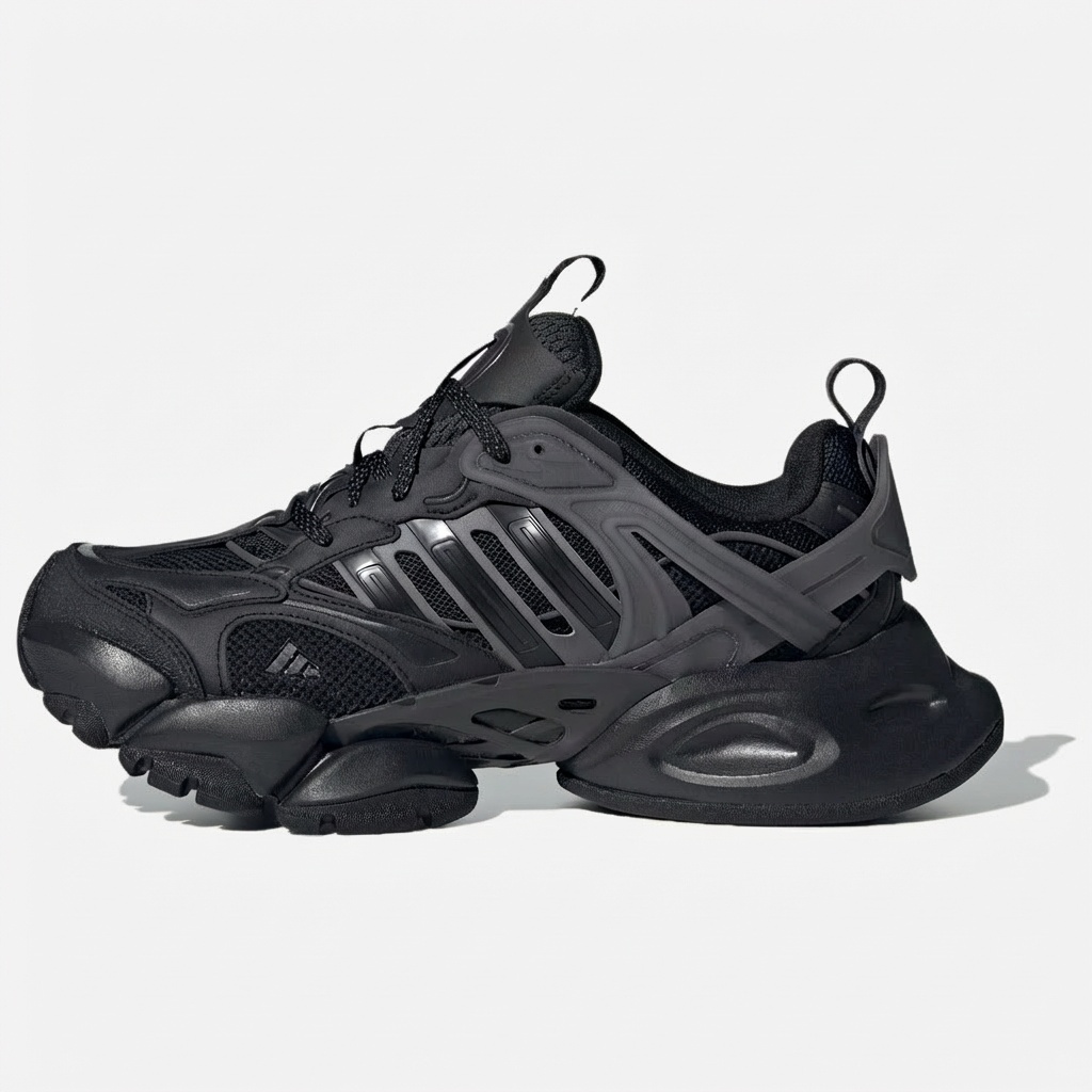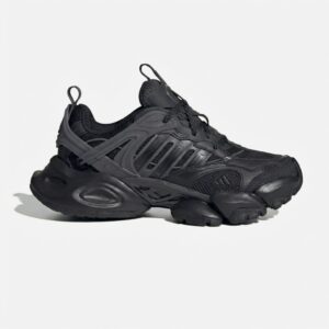 Buty sportowe ADIDAS XLG RUNNER DELUXE prezentują nowoczesną interpretację chunky sneakersów w monochramatycznej czarnej kolorystyce. Wielowarstwowa konstrukcja łączy siatkę tekstylną, elementy ze skóry syntetycznej oraz wzmocnienia z tworzywa sztucznego. Masywna podeszwa z wyraźnie zaznaczonymi rowkami i wgłębieniami zapewnia charakterystyczny wygląd oraz funkcjonalną amortyzację.