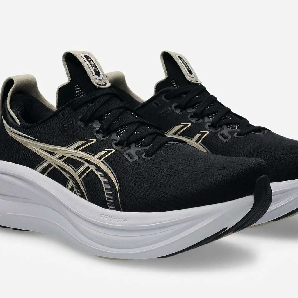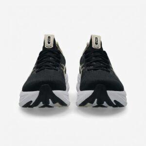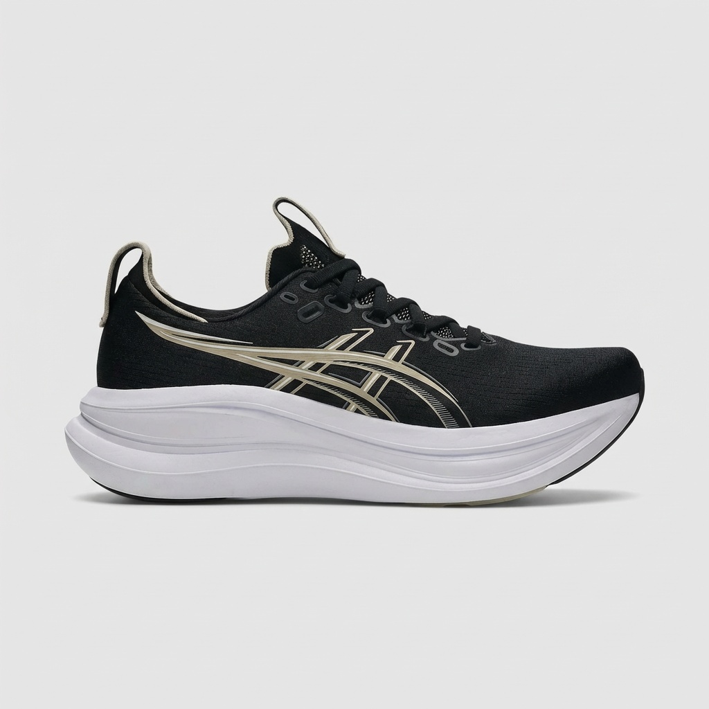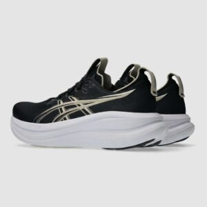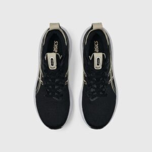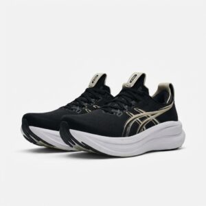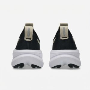 ASICS GEL-NIMBUS 28 to buty biegowe w klasycznej kolorystyce czarnej z białymi akcentami. Cholewka łączy materiały tekstylne z elementami syntetycznymi, tworząc strukturę zapewniającą stabilność stopy. Charakterystyczne logo marki w kolorze champagne dodaje elegancji sportowej sylwetce.