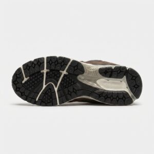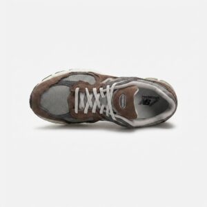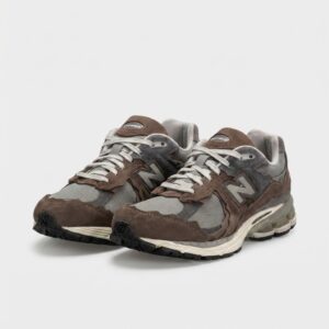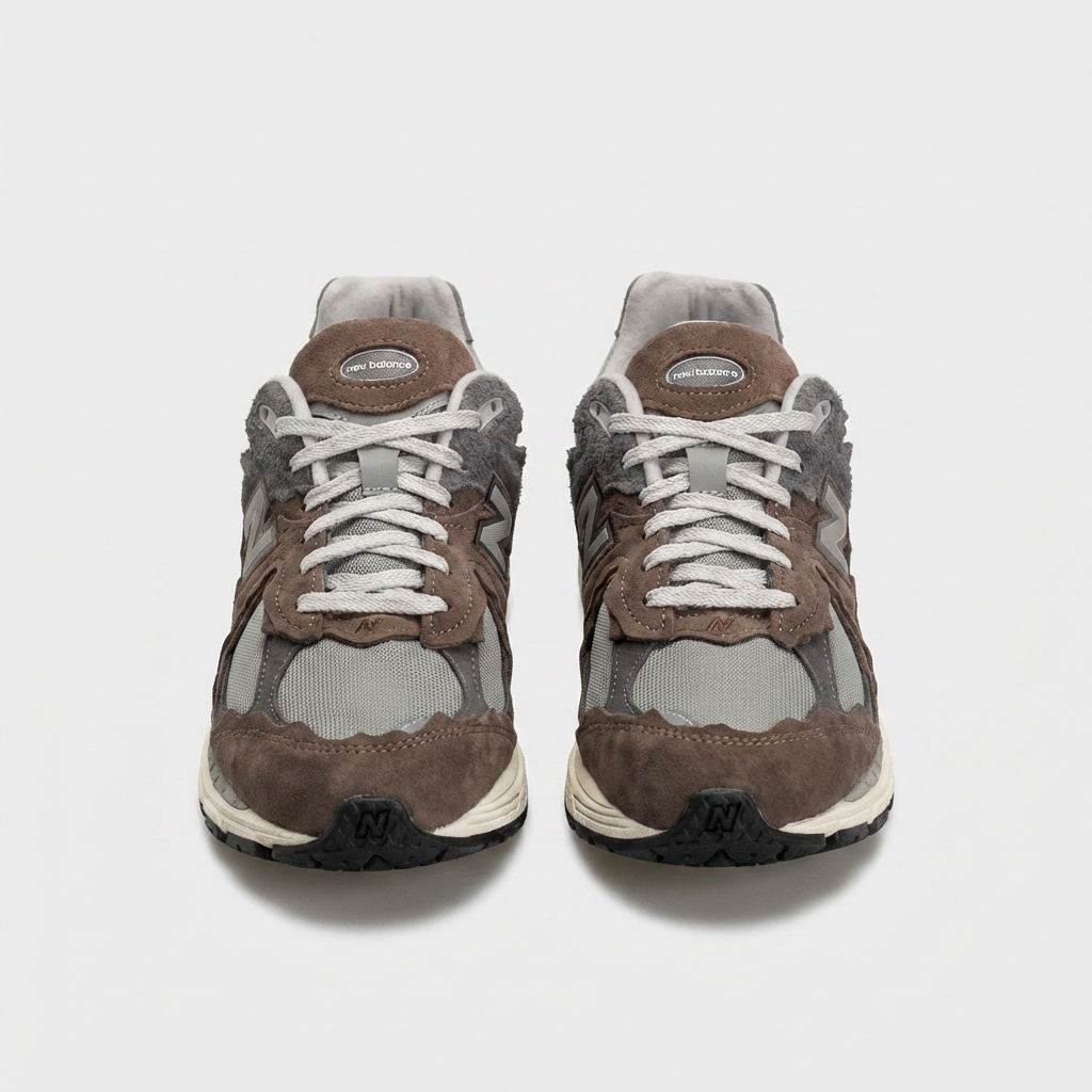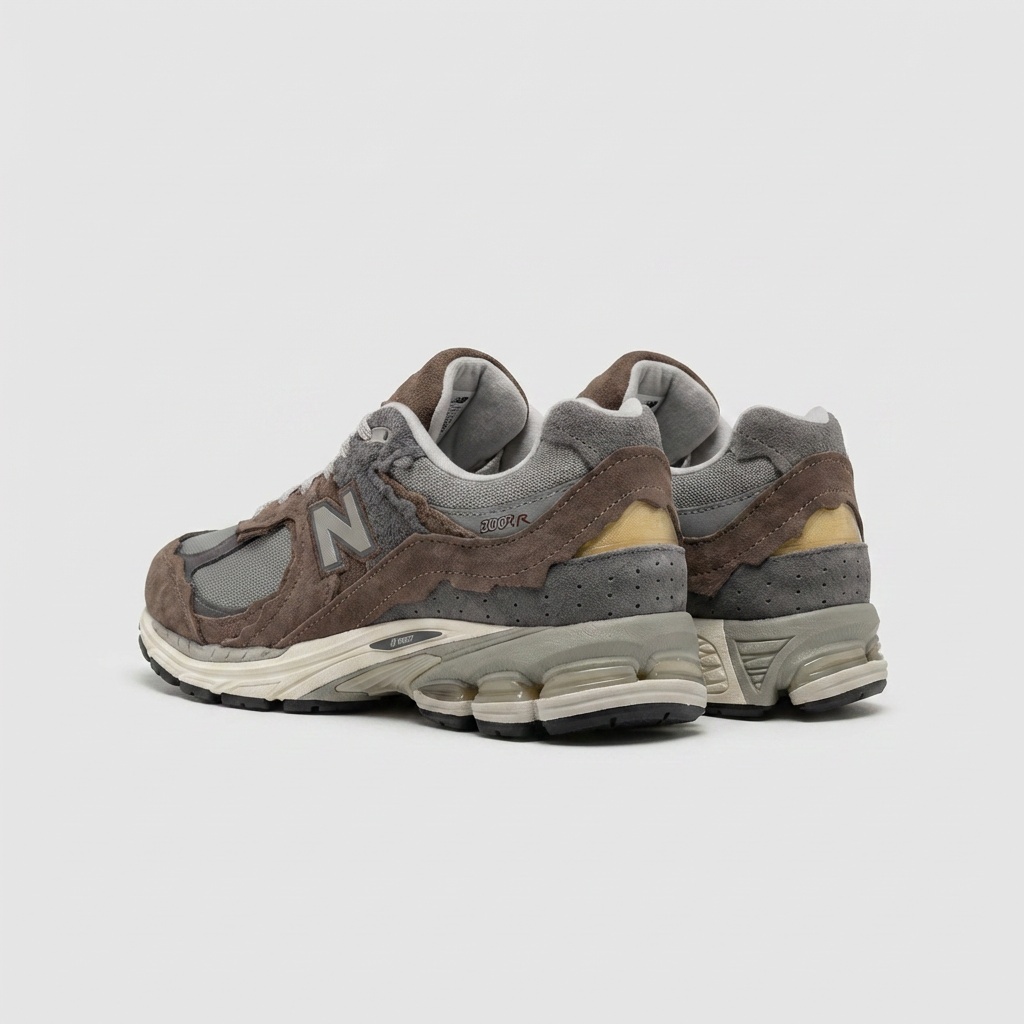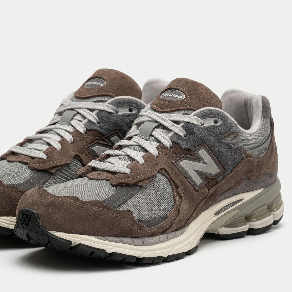Model 2002R z limitowanej kolekcji Protection Pack łączy klasyczną estetykę lat 2000 z nowoczesnymi rozwiązaniami technicznymi. Górna część buta została wykonana z wysokogatunkowej skóry zamszowej w odcieniach brązu, uzupełnionej szarymi wstawkami z materiału tekstylnego i siatki mesh. Charakterystyczny design podkreślają kontrastowe przeszycia oraz logo N w metalicznym wykończeniu.