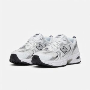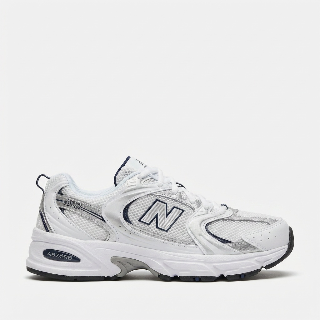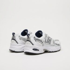 Buty New Balance 530 to klasyczne sneakersy w uniwersalnej białej kolorystyce z szarymi akcentami. Model wyróżnia się charakterystyczną perforacją w części przedniej oraz kontrastowymi szarymi wstawkami na cholewce. Konstrukcja z materiałów tekstylnych i syntetycznych zapewnia trwałość i komfort noszenia.