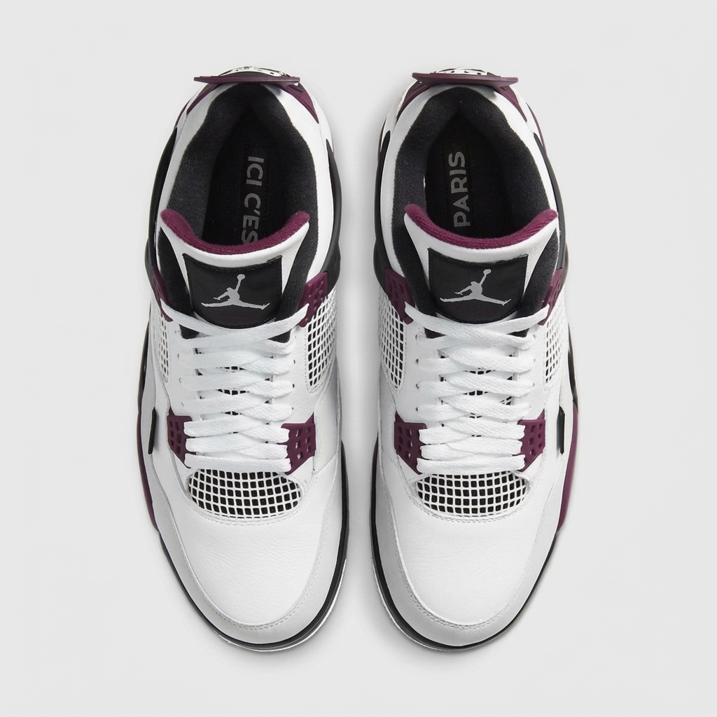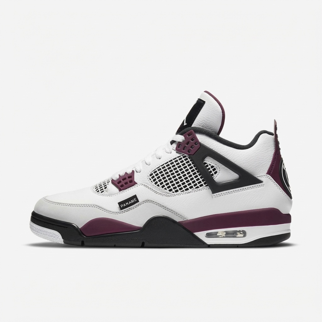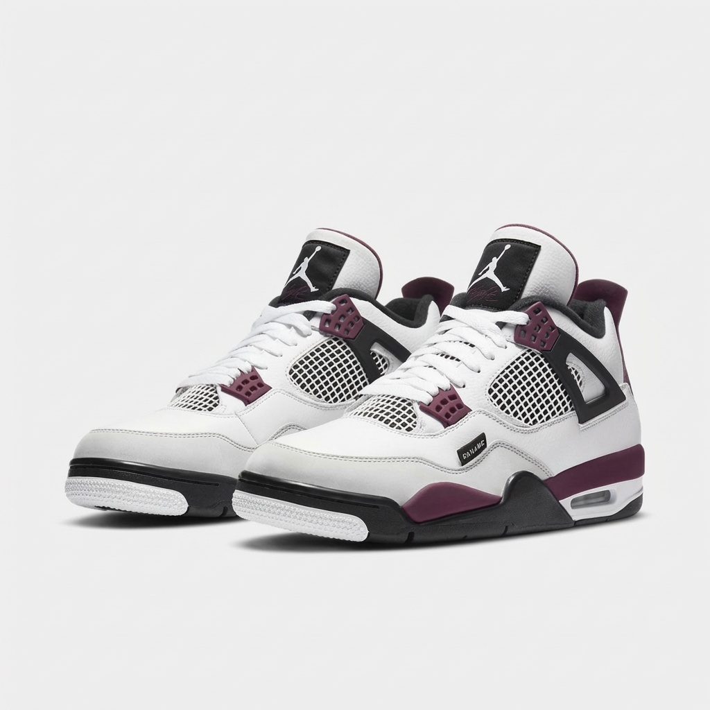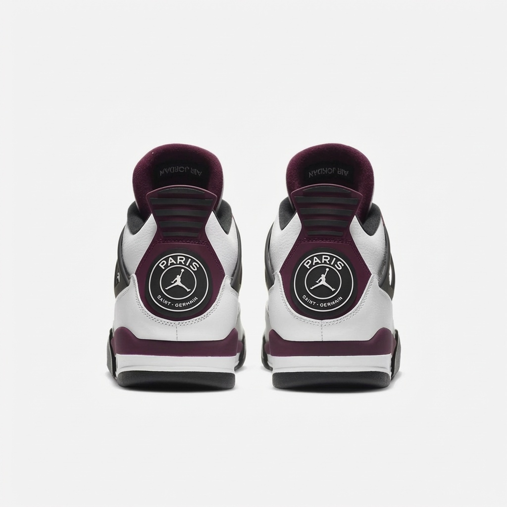Nike Air Jordan 4 Retro w wersji Paris Saint-Germain to interpretacja klasycznego modelu z 1989 roku. Biała skóra naturalna dominuje w konstrukcji, uzupełniona burgundowymi elementami na pięcie i uszach. Charakterystyczna siateczka pokrywa przód buta, a system sznurowania stabilizuje stopę.