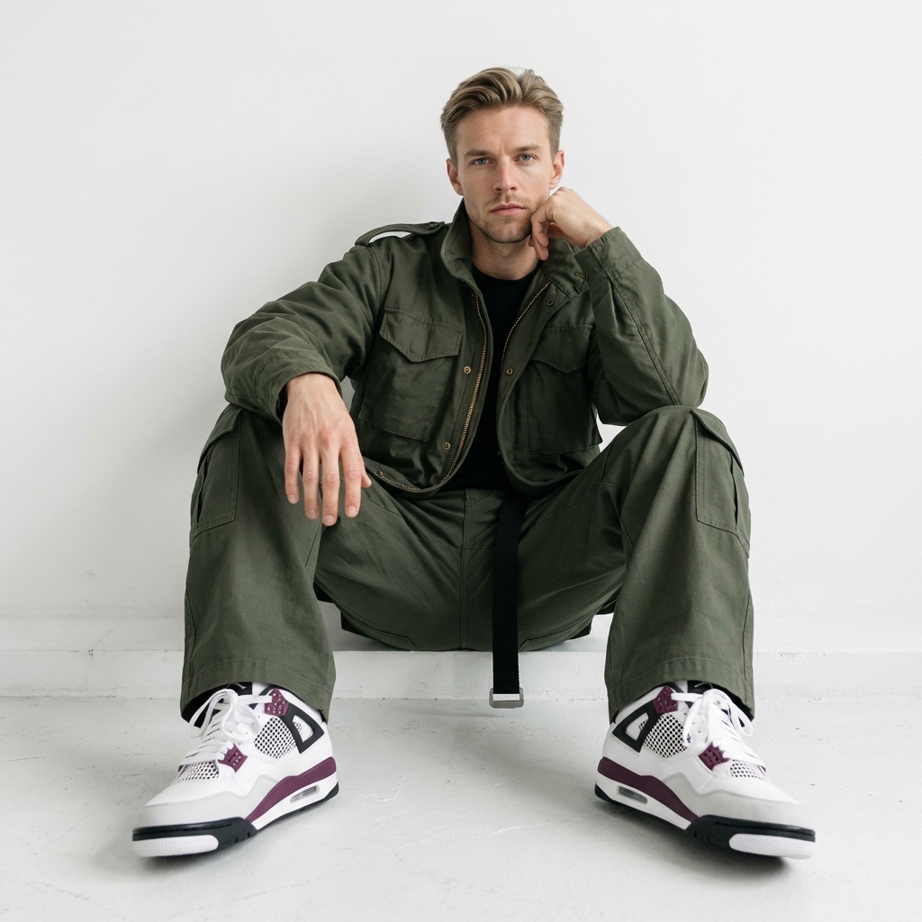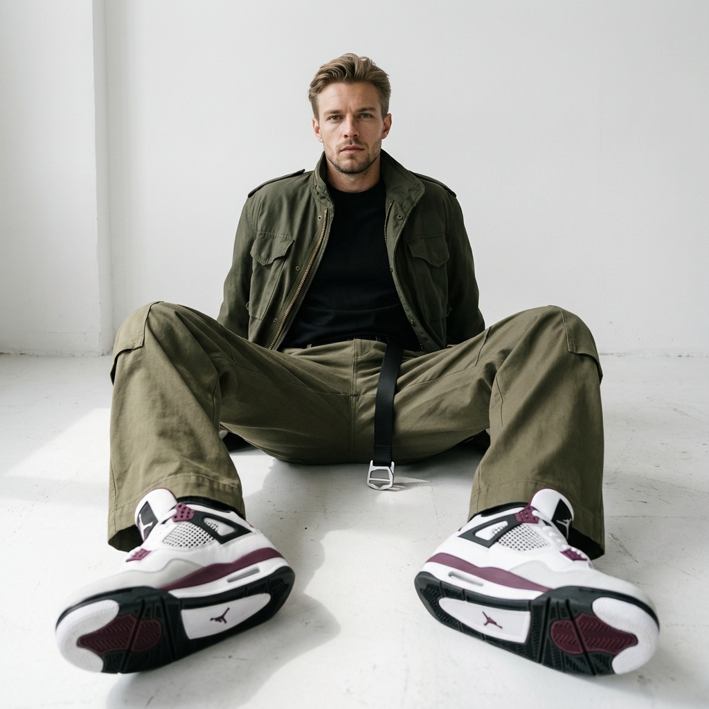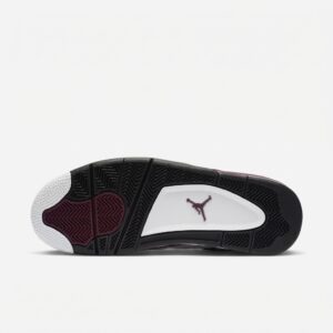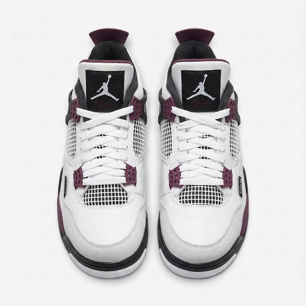 Nike Air Jordan 4 Retro w wersji Paris Saint-Germain to interpretacja klasycznego modelu z 1989 roku. Biała skóra naturalna dominuje w konstrukcji, uzupełniona burgundowymi elementami na pięcie i uszach. Charakterystyczna siateczka pokrywa przód buta, a system sznurowania stabilizuje stopę.