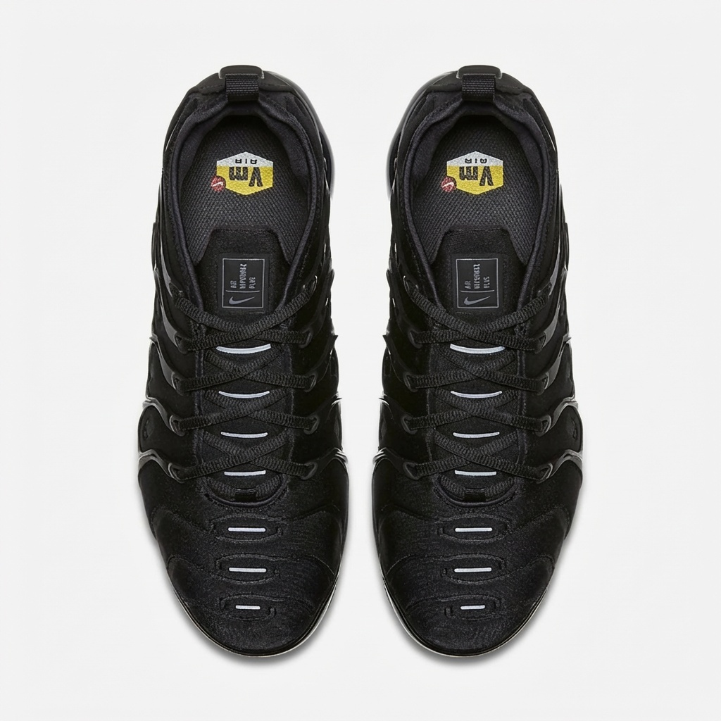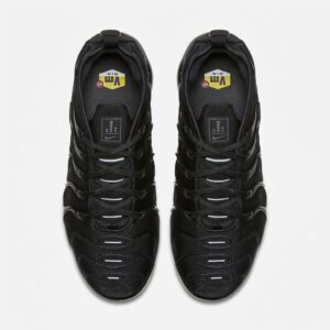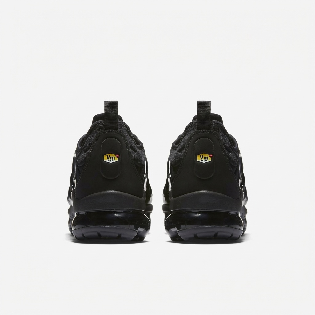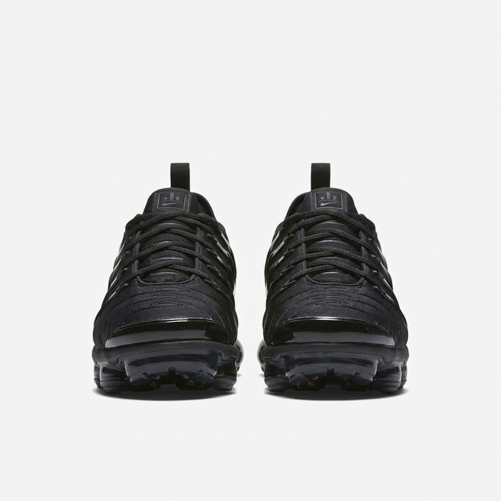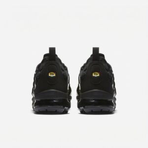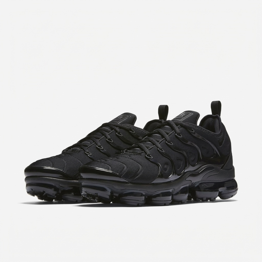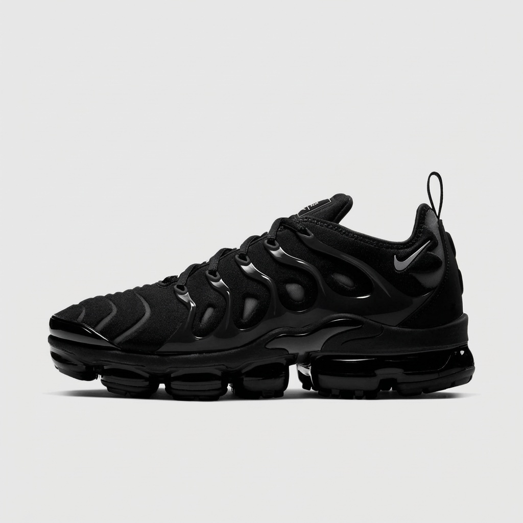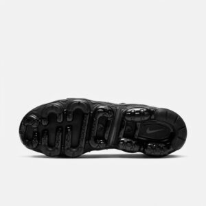 Nike Air VaporMax Plus w wersji Triple Black to sportowe buty łączące technologię Air Max z futurystycznym designem. Całkowicie czarna kolorystyka obejmuje górną część z materiałów tekstylnych i syntetycznych oraz podeszwę środkową z widocznymi kapsułami powietrznymi. Model wyróżnia się charakterystycznymi falami i przepływającymi liniami inspirowanymi naturą.