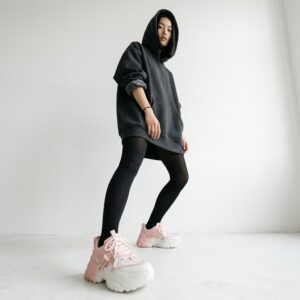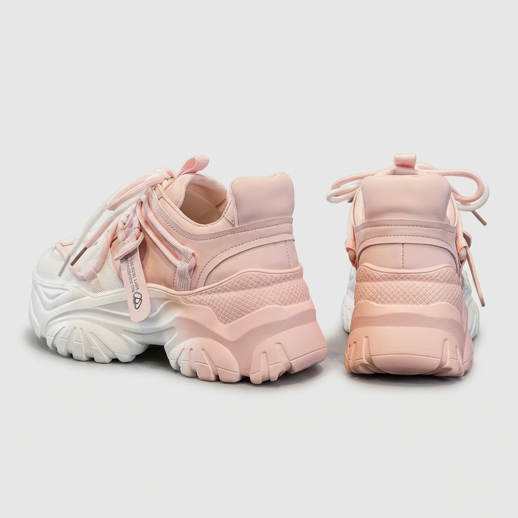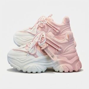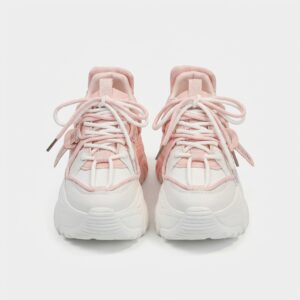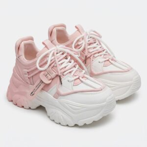 Sneakersy damskie w kolorystyce biało-różowej reprezentujące trend chunky sneakers. Model charakteryzuje się masywną, rzeźbioną podeszwą oraz wielowarstwową konstrukcją cholewki. Dodatkowe paski z plastikowym zapięciem podkreślają sportowy, futurystyczny charakter obuwia.