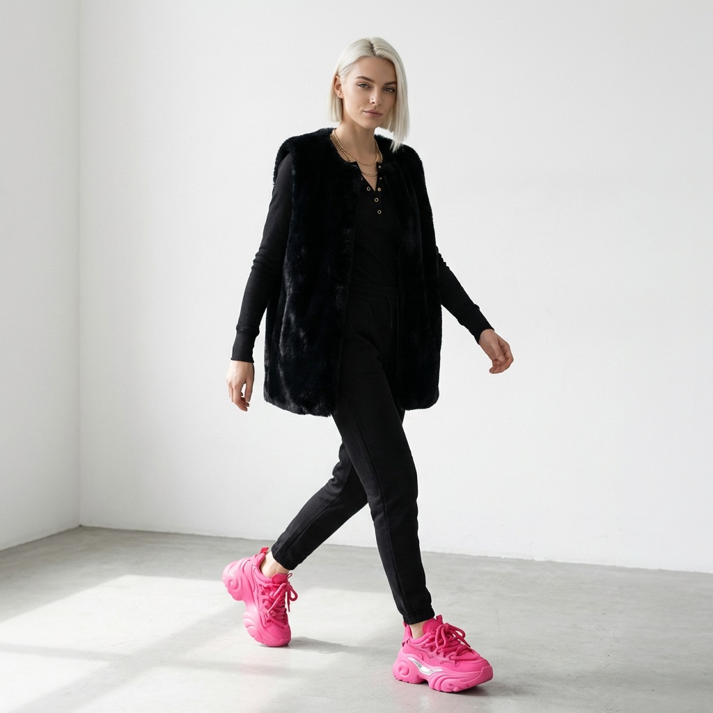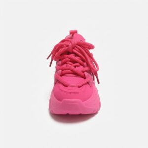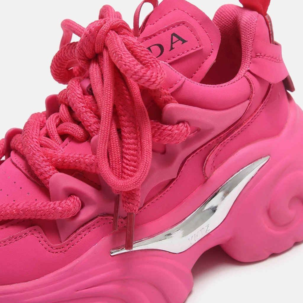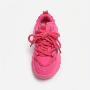 Różowe sneakersy damskie wyróżniają się masywną, rzeźbioną podeszwą typu chunky o wysokości około 5 cm. Cholewka łączy ekoskórę z materiałem tekstylnym w intensywnym odcieniu różu. Srebrny detal w kształcie płomienia na boku oraz grube sznurowanie dopełniają futurystycznego charakteru obuwia.