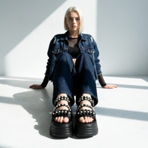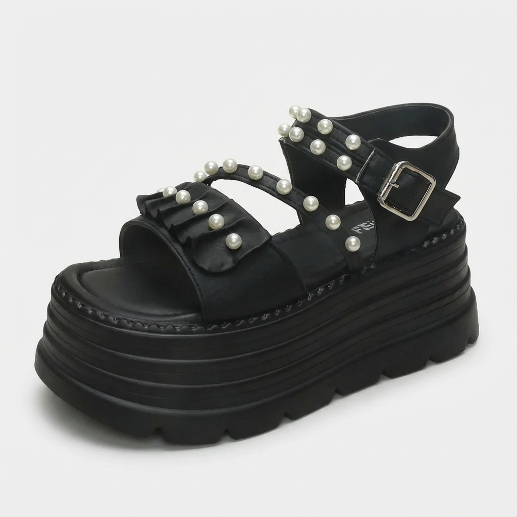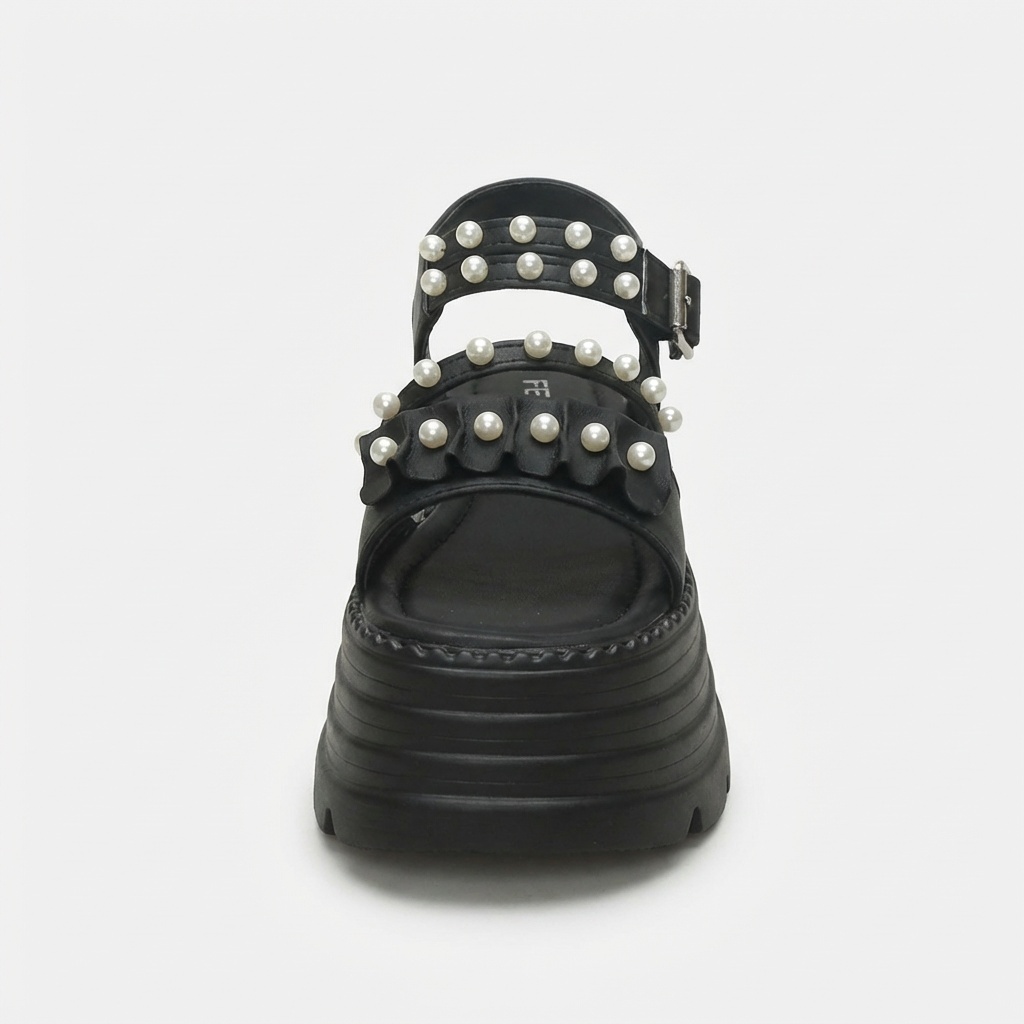 Czarne sandały na platformie łączą miejski styl z elementami glamour. Masywna podeszwa o wysokości 6 cm zapewnia stabilność i komfort chodzenia. Dekoracyjne perły rozmieszczone na paskach nadają obuwiu elegancki akcent.