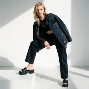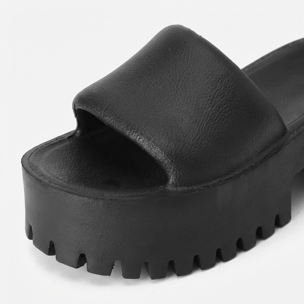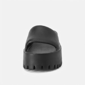 Klapki na platformie łączą komfort z nowoczesnym designem. Jednolita czarna kolorystyka i minimalistyczna forma sprawiają, że pasują do wielu stylizacji. Pianka EVA charakteryzuje się lekkością i elastycznością, dostosowując się do kształtu stopy.