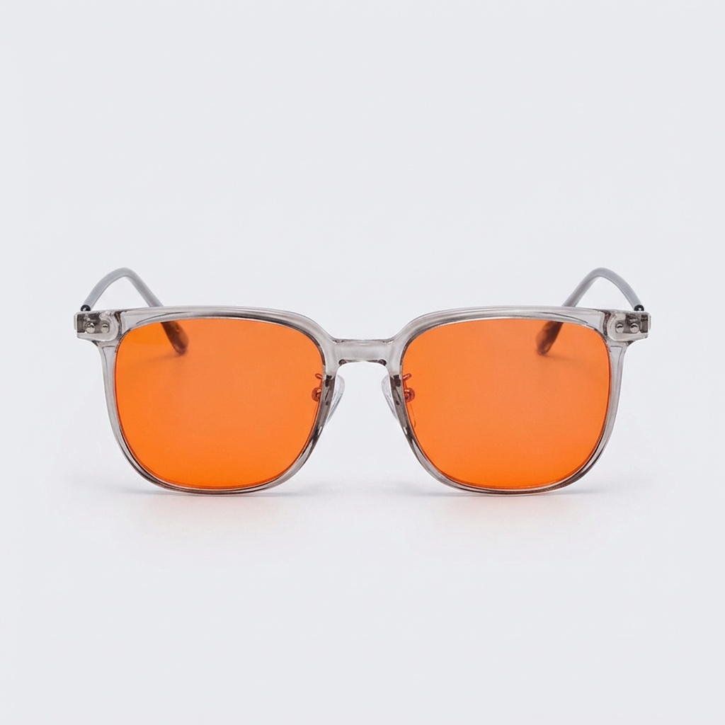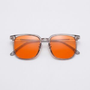 Okulary przeciwsłoneczne w przezroczystej oprawie łączą funkcjonalność z nowoczesnym designem. Pomarańczowe szkła z filtrem UV 400 chronią oczy przed szkodliwym promieniowaniem słonecznym. Wykonane z polipropylenu i stali zapewniają trwałość i komfort noszenia.