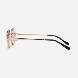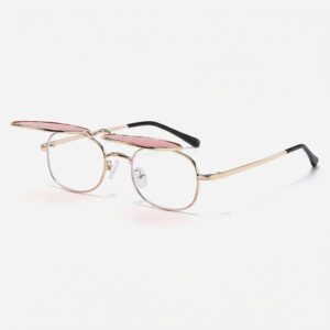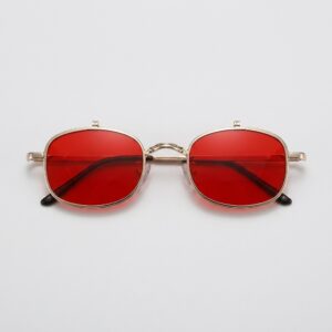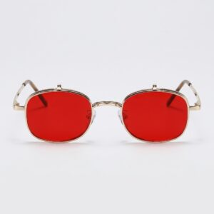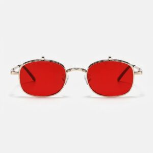 Okulary przeciwsłoneczne z funkcją podnoszenia szkieł łączą klasyczną estetykę ze współczesną funkcjonalnością. Stalowa rama w złotym wykończeniu wyposażona jest w czerwone soczewki z filtrem UV 400. Mechanizm uchylania szkieł umożliwia płynne przejście między ochroną przeciwsłoneczną a normalnym widzeniem.