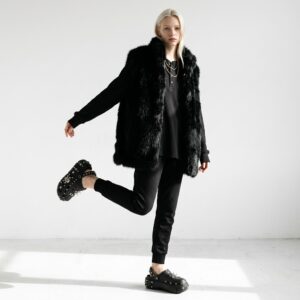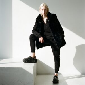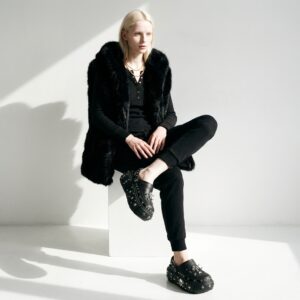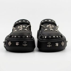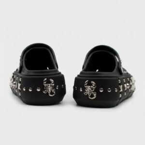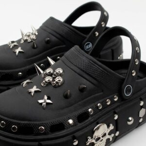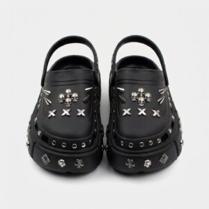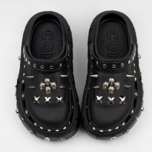 Czarne klapki na koturnie o wysokości 4 cm z ekstrawaganckim wzorem metalowych ćwieków i motywami czaszek. Wykonane z miękkiej pianki EVA, która zapewnia lekkość i wygodę przez cały dzień. Regulowany pasek z metalową klamrą pozwala na indywidualne dopasowanie do stopy.