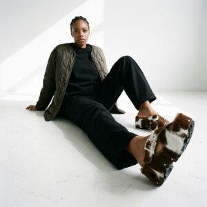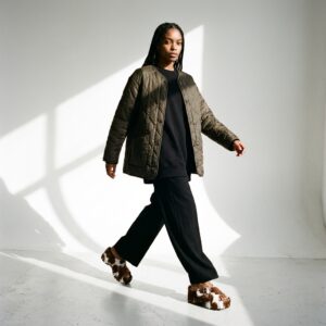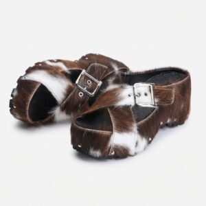 Klapki na koturnie łączące komfort z odważnym designem. Charakteryzują się naturalnym motywem w kolorystyce brązowo-białej, który nadaje im unikalny charakter. Wykonane ze skóry ekologicznej z miękkimi wstawkami futerkowych elementów.