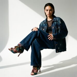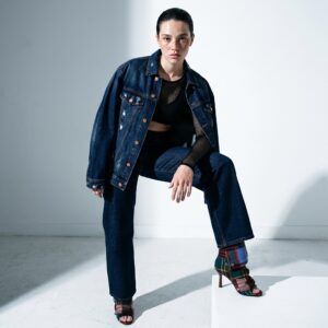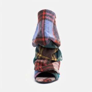 Wysokie botki damskie łączące elegancję szpilek z casualowym charakterem materiału w kratę. Model wykonany z miękkiego materiału tekstylnego w intensywnej kolorystyce – połączenie granatu, czerwieni, zieleni i różu w geometryczne wzory. Konstrukcja z odkrytymi palcami i zapięciem na zamek z tyłu zapewnia wygodne założenie.