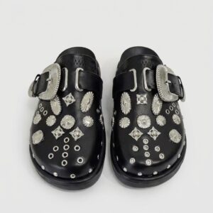 Czarne klapki ze skóry ekologicznej wyróżniają się bogatą kompozycją metalowych ćwieków i aplikacji rozmieszczonych na całej powierzchni cholewki. Charakterystyczne elementy ozdobne w formie różnych kształtów geometrycznych nadają butom rockowy charakter. Regulowany pasek z metalową klamrą w kolorze srebra zapewnia stabilne dopasowanie.